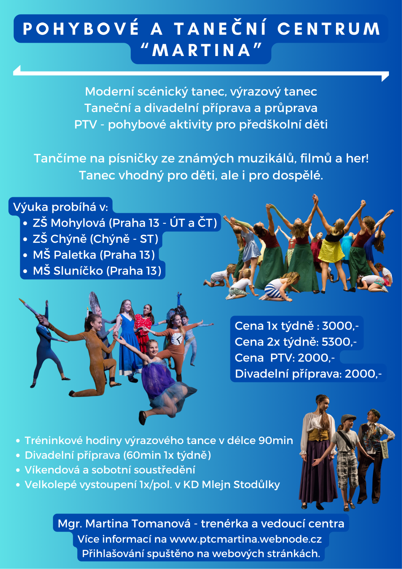 Cena za 1.pololetí, pokud dítě navštěvuje dramatickou hodinu (v ZŠ Mohylová) a dvě taneční hodiny týdně = 7 250,-/pol.